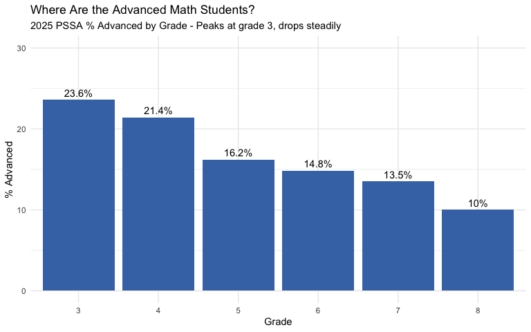 subtitle = "2025 PSSA % Advanced by Grade - Peaks at grade 3, drops steadily",