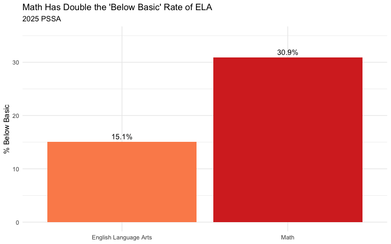 Almost 28% of Pennsylvania students score at the lowest proficiency level - they haven’t mastered foundational math concepts. This is double the ELA rate.