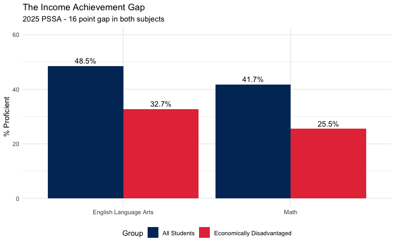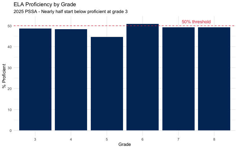 subtitle = "2025 PSSA - Nearly half start below proficient at grade 3",