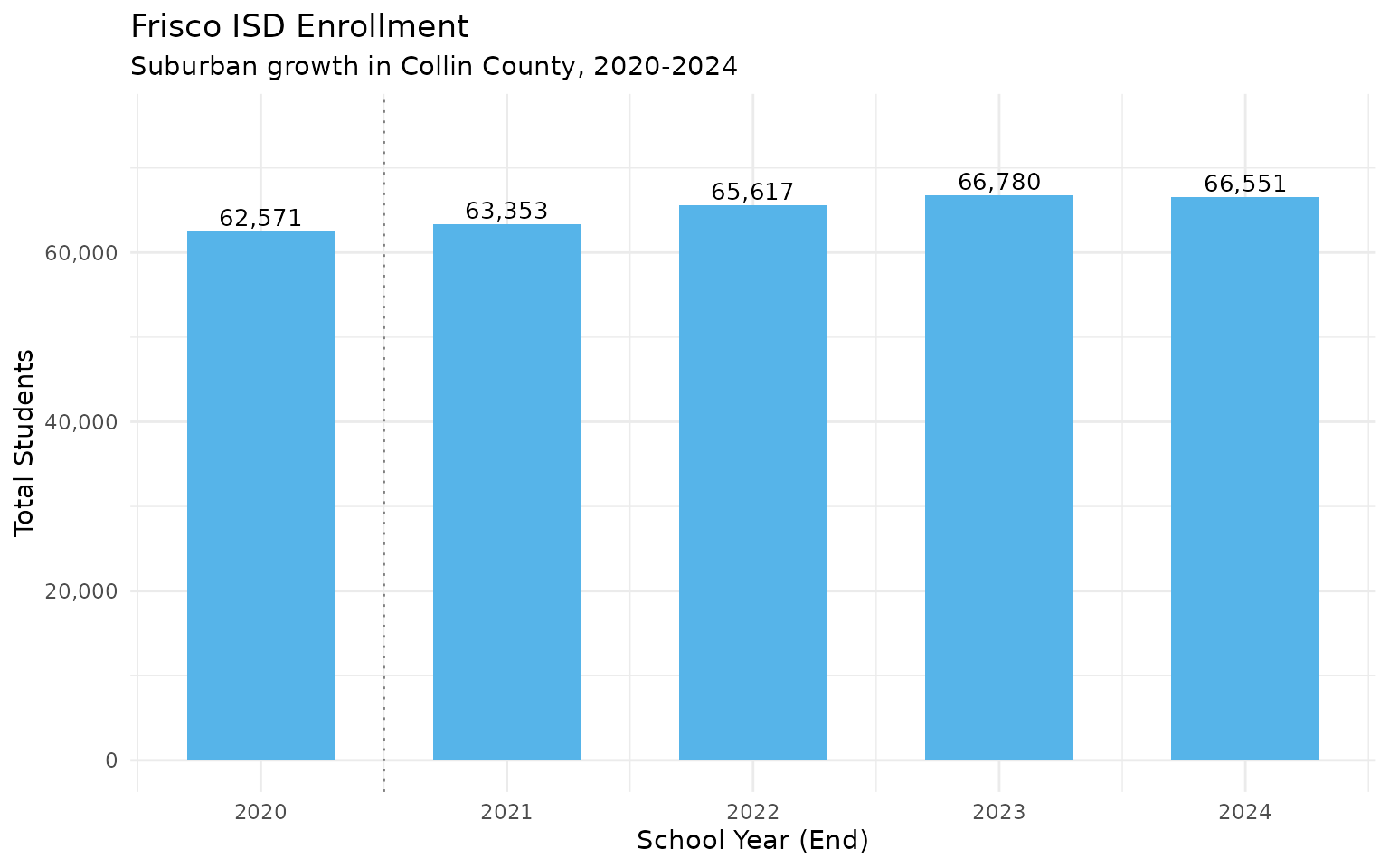 district-hooks.RmdTexas public schools enroll over 5.5 million students across 1,200+ districts, making it the second-largest school system in the United States. This analysis explores the most striking patterns in Texas enrollment data from 2020-2024.
