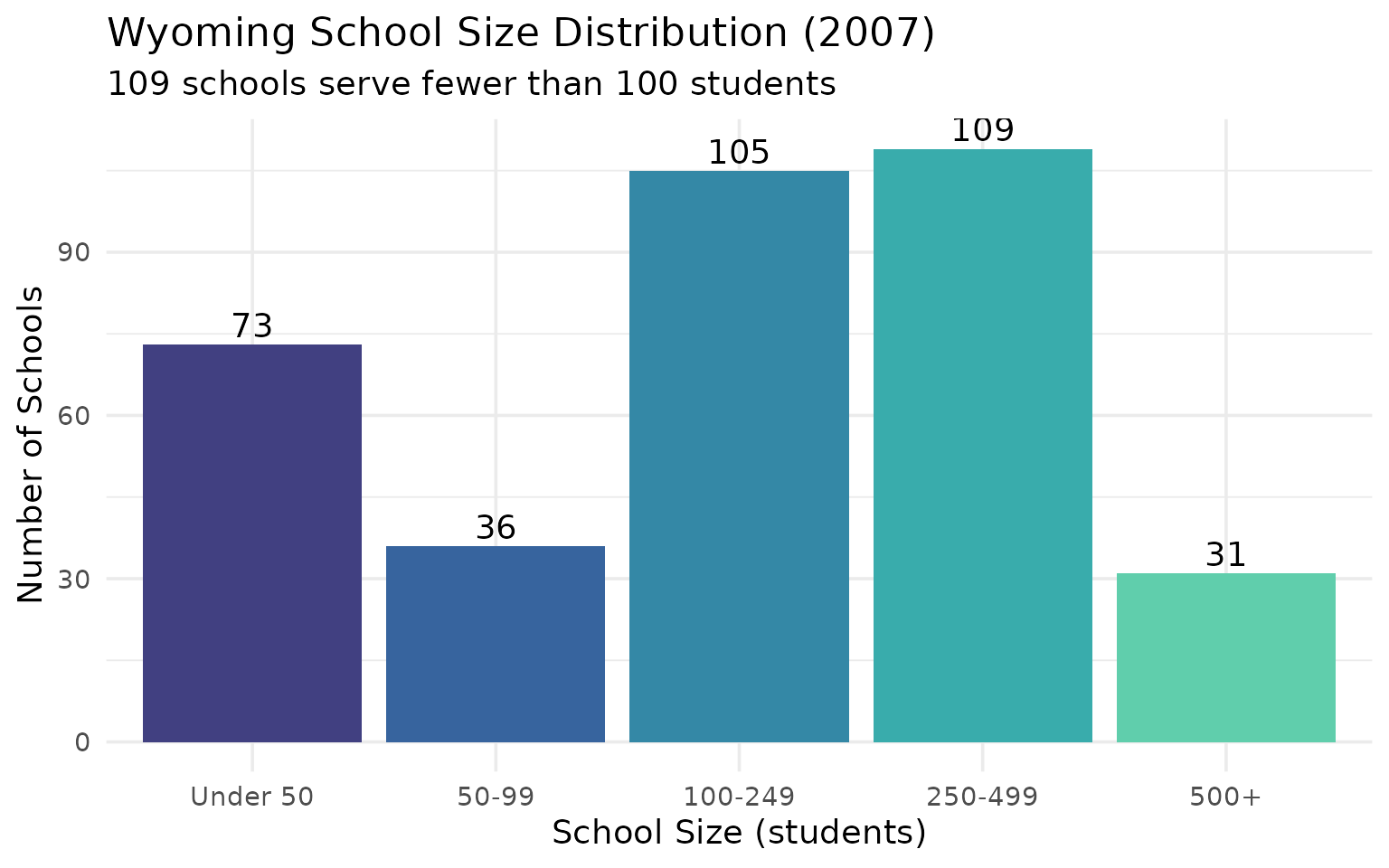 Wyoming keeps schools open in communities so small that the entire district could fit in a single classroom. Washakie #2 (Ten Sleep) enrolled 96 students in 2007; Sheridan #3 (Clearmont) had 101.